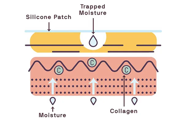 The silicone patch utilizes pressure in its mode of operation, which contributes to the softening of wrinkles and reduces swelling.