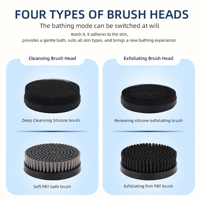 This multifunctional shower brush comes with four interchangeable brush heads, allowing users to customize their bath routine according to different skin needs: